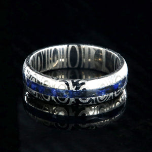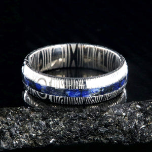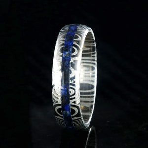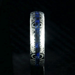 This Damascus Steel ring shines bright against the dark contrast of a deep blue lapis lazuli inlay giving this ring a powerful presence. This Damascus steel wedding ring is made with care and precision to ensure comfortable all-day wear and durability for the everyday activities of life.