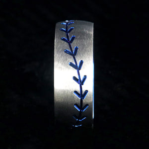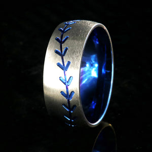 Show your love for sports with this amazing blue anodized baseball ring! Made out of titanium, this ring is 8mm wide and features a milled blue anodized baseball pattern all around the outside of the ring. It is a comfort fit ring with a stone finish top and a shiny, smooth, polished blue inside. This unique ring is one you won't want to pass upon. Order today!