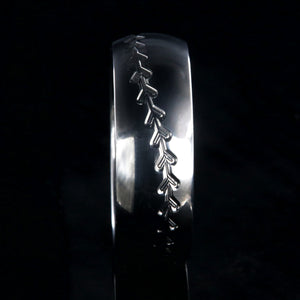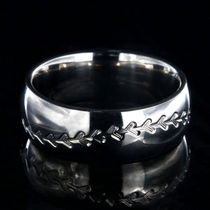 This USA made Baseball Stitch ring is custom made for you once ordered. The ring is made, hand-finished, and edged by skilled jewelry artisans. The comfort fit aerospace-grade titanium baseball ring is strong, durable, hypoallergenic, and a great ring for any Baseball lover! This baseball band measures 8mm wide has a domed profile and an inside comfort fit design. The Baseball Stitch on the ring is etched around the entire band.