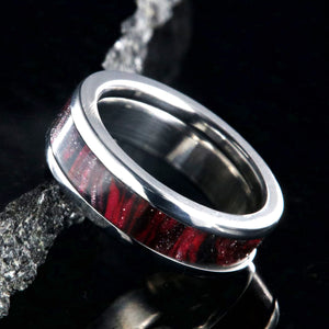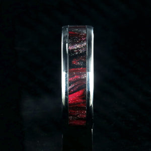 Stunning 6mm titanium ring with a 3.5mm wide DiamondCast™ Derby Girl inlay. This wedding band is custom-made for you right here in the USA by skilled artisans who have an uncompromising passion for quality and style. The finish on this ring is polished with a flat top profile and slightly rounded edges.