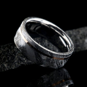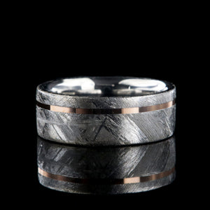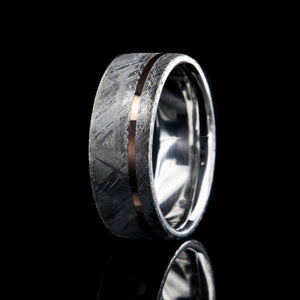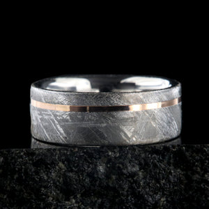 Forge a lifetime bond with a ring that’s truly out of this world. This 8mm men's wedding band features authentic Gibeon meteorite, showcasing its distinctive natural etching, and is accented with a refined off-center 14K rose gold inlay. The warm rose gold contrasts beautifully with the textured gray meteorite, creating a modern and meaningful statement piece.